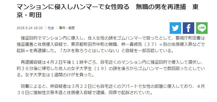 2018年、町田市のマンションのエントランスに侵入し帰宅した19歳の女性の頭をゴムハンマーで殴り怪我をさせ、現金などを奪おうとした疑い。それ以前にも2018年3月に女性宅に侵入し性暴行を加えようとして逮捕・起訴されていた。