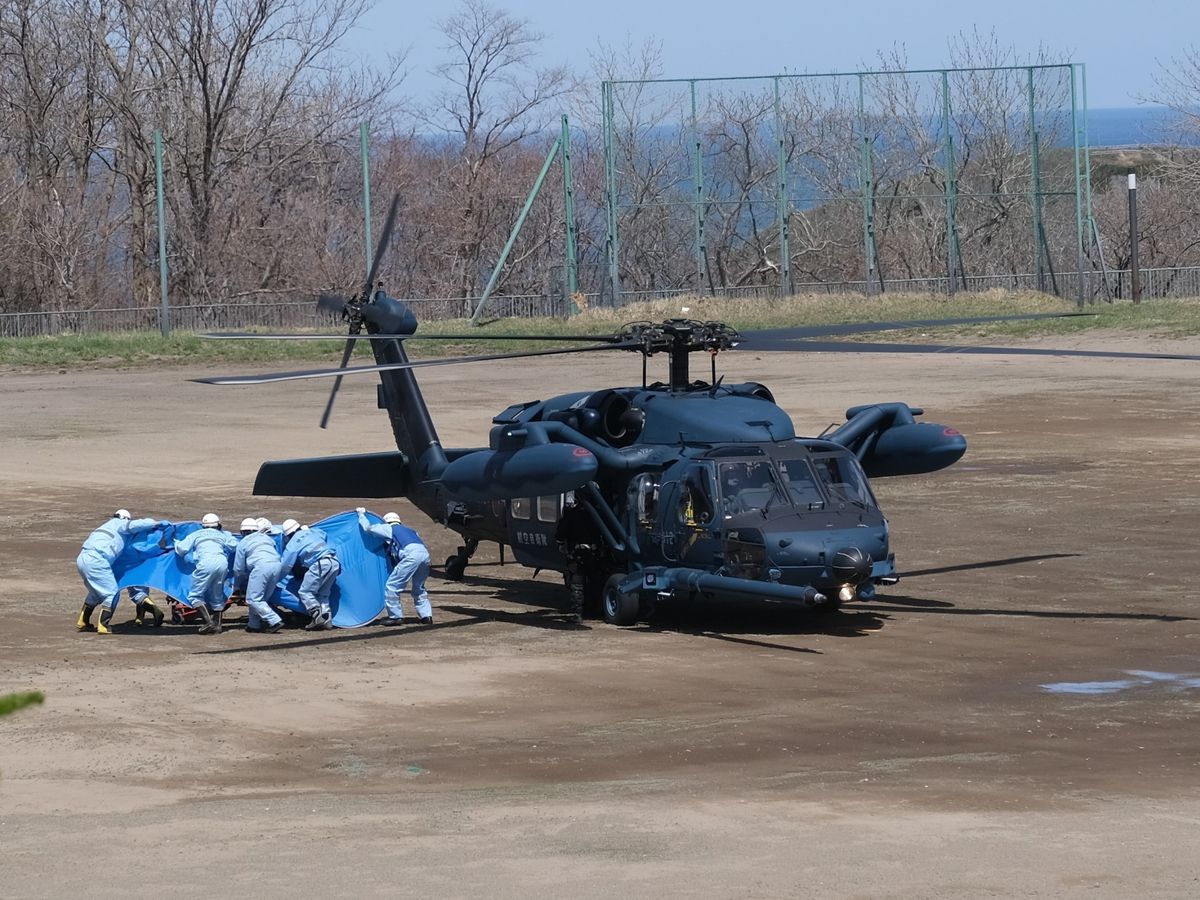 【写真】救助された3人をヘリコプターから担架に乗せる救急隊員=24日午前10時36分、北海道斜里町の町立知床ウトロ学校(鵜野光博撮影)
