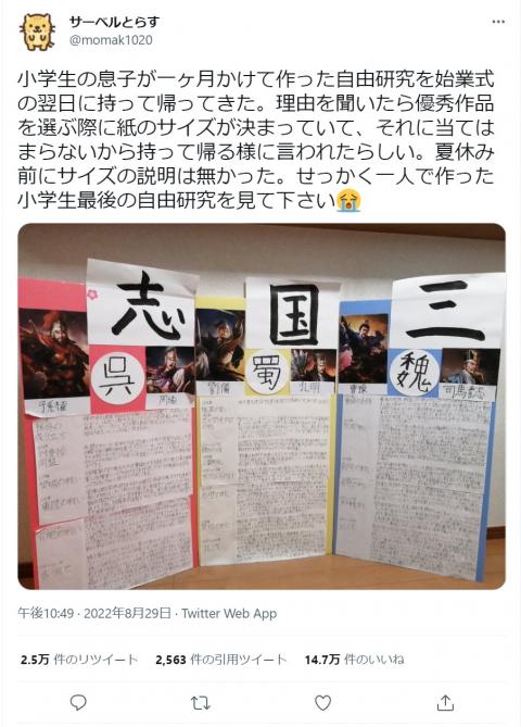 小学生の息子が一ヶ月かけて作った自由研究を始業式の翌日に持って帰ってきた。理由を聞いたら優秀作品を選ぶ際に紙のサイズが決まっていて、それに当てはまらないから持って帰る様に言われたらしい。夏休み前にサイズの説明は無かった。せっかく一人で作った小学生最後の自由研究を見て下さい
