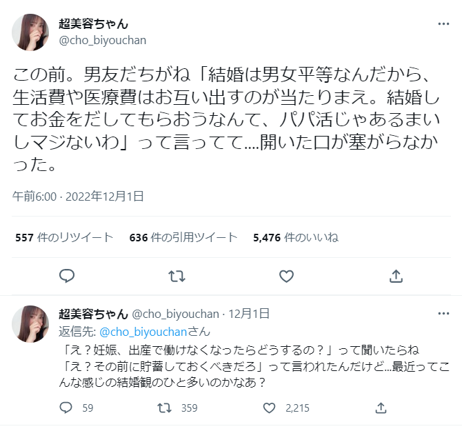 ホーム > 友人・知人・その他 > 男友達が結婚したら平等に金を出すべきって言っててドン引き。こんな結婚観が普通になるのは嫌 2022/12/04 【悲報】女さん「男友達がね…結婚したら平等に金を出すべきだって言ってて…開いた口が塞がらなかった?」 1: 名無しさん@おーぷん 22/12/02(金) 00:24:37 ID:c8m1 https://twitter.com/cho_biyouchan/status/1598059358784405505 続きを読む B! LINEへ送る - 友人・知人・その他, 投稿