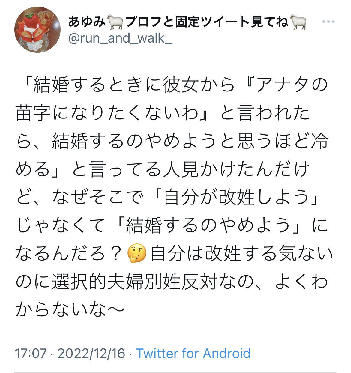 ホーム > 交際・婚約 > 婚約者に「あなたの名字になりたくない」と言ったら「じゃあ結婚やめる?」と返された 2022/12/24 【悲報】女性「あなたの名字になりたくない」 男さん「じゃあ結婚やめる?」←なぜそうなる?w 1: 風吹けば名無し 2022/12/22(木) 16:27:49.54 ID:IJkEtuW60 続きを読む B! LINEへ送る - 交際・婚約, 投稿
