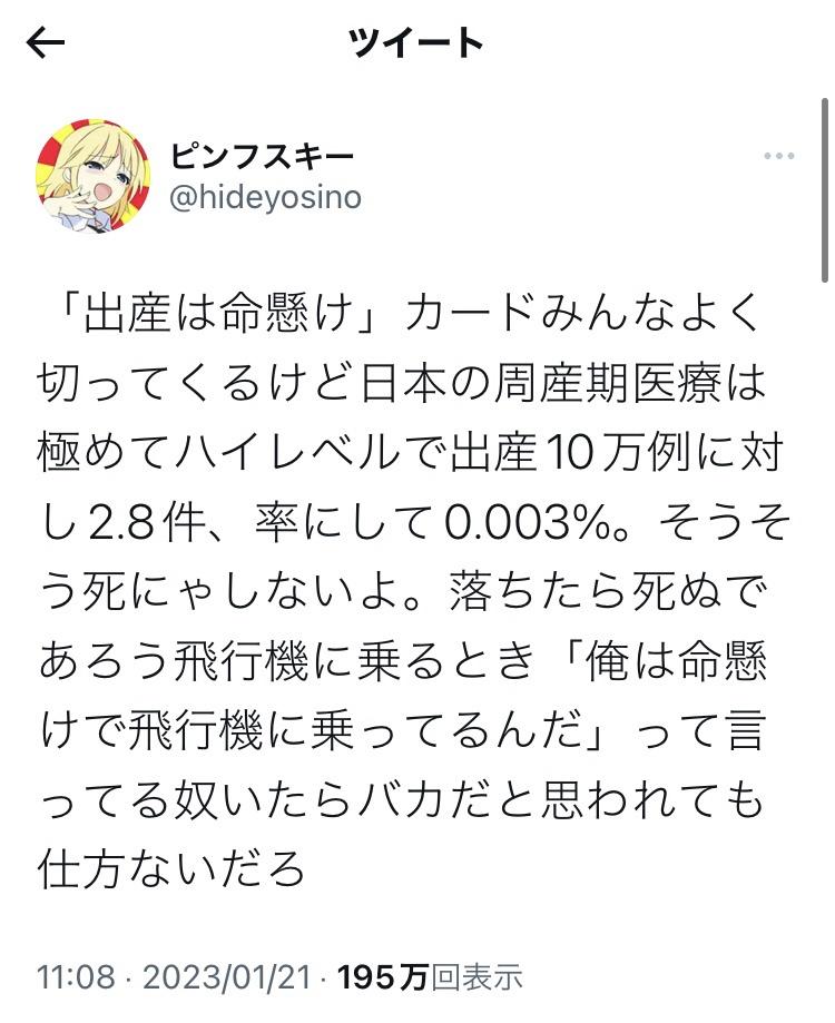 弱者男性「ギャオオオオン!出産死亡率は飛行機事故と同じ確率!命懸けなんて言葉使うな!」