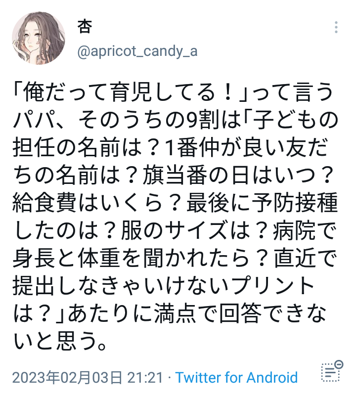 ホーム > 投稿 > 俺だって育児してるって言う男は9割無能。子供の情報をほとんど把握してない 2023/02/16 【悲報】女さん「俺だって育児してるって言う男は9割無能」←女性から大絶賛wwwwwww 1: 以下、5ちゃんねるからVIPがお送りします 2023/02/14(火) 16:57:29.173 ID:ByYI5DF8aSt.V イクメン涙目 続きを読む B! LINEへ送る - 投稿, 男性・女性