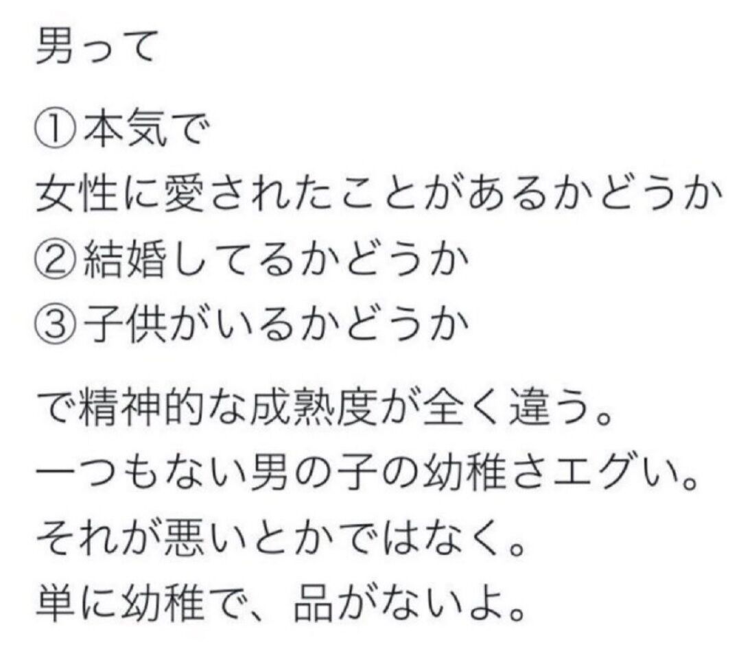ホーム > 交際・婚約 > 男って女性に本気で愛された事があるかどうかで精神的成熟度が全く違う 2023/02/20 【悲報】女さん、火の玉ストレート 1: 名無しさん@おーぷん 23/02/14(火) 14:54:43 ID:7Yqv 続きを読む B! LINEへ送る - 交際・婚約, 投稿