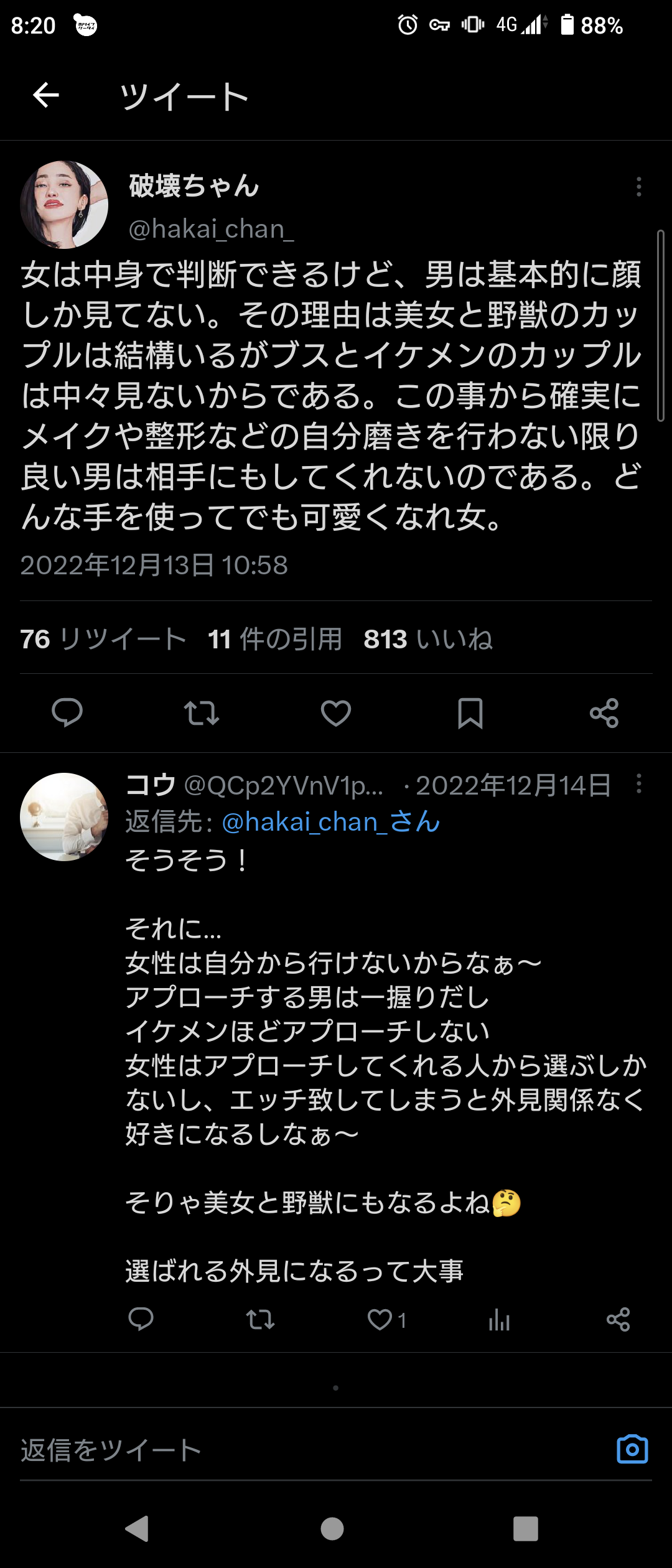 女は中身で判断できるけど男は基本的に顔しか見てない。美女と野獣の反対は中々見ない