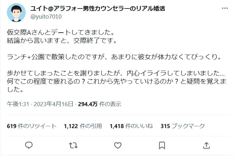 ホーム > 投稿 > 彼女の体力がなさすぎてびっくり。公園散策程度で疲れてこの先やっていけるのか 2023/04/20 【悲報】婚活男さん「彼女の体力がなさすぎてびっくり。イライラしたので交際終了です」←なぜか炎上してしまうwwwwwwwwwwwww 1: 名無しさん@おーぷん 23/04/17(月) 21:18:34 ID:lkOI https://twitter.com/yuito7010/status/1647457583505227778 続きを読む B! LINEへ送る - 投稿, 身体・健康