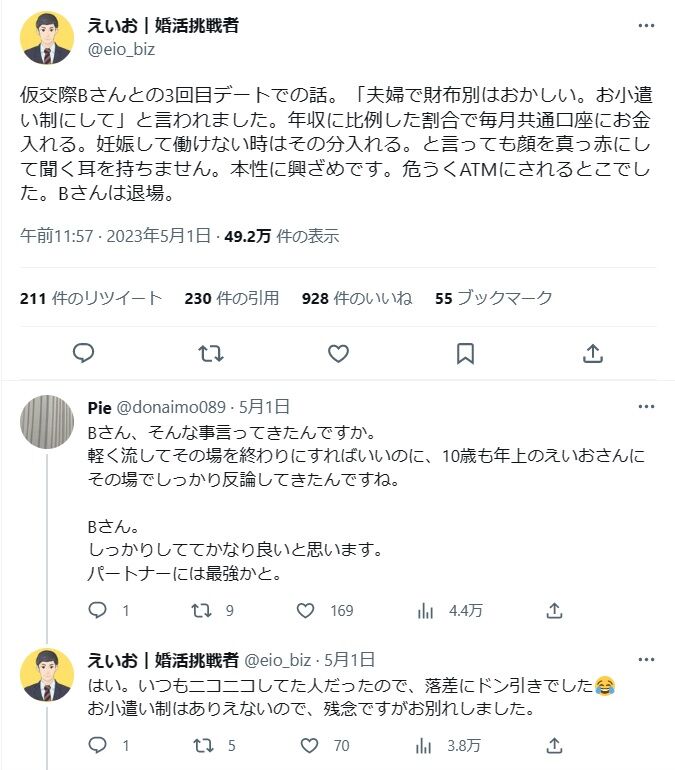 ホーム > 交際・婚約 > 婚活相手がいきなり「夫婦で財布別はおかしい。お小遣い制にして」と言い出した 2023/05/05 【悲報】婚活男さん「小遣い制にはしません」婚活女さん「……!」シュババババ 1: 名無しさん@おーぷん 23/05/03(水) 11:28:28 ID:VGFR https://twitter.com/eio_biz/status/1652869711200423938 続きを読む B! LINEへ送る - 交際・婚約, 投稿