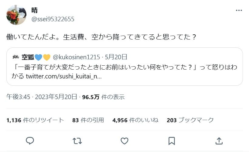 ホーム > 投稿 > 「育児大変な時に夫は何やってたんだ!」と言う女は無能。働いて生活費を稼いでるんだよ 2023/05/24 無能女「育児大変な時に夫は何やってたんだ!」有能女「働いてたんだよ」 1: 名無しさん@おーぷん 23/05/21(日) 00:57:15 ID:P02k うーんこの綺麗な論破 https://twitter.com/ssei95322655/status/1659812477365030913 続きを読む B! LINEへ送る - 投稿, 放置・託児