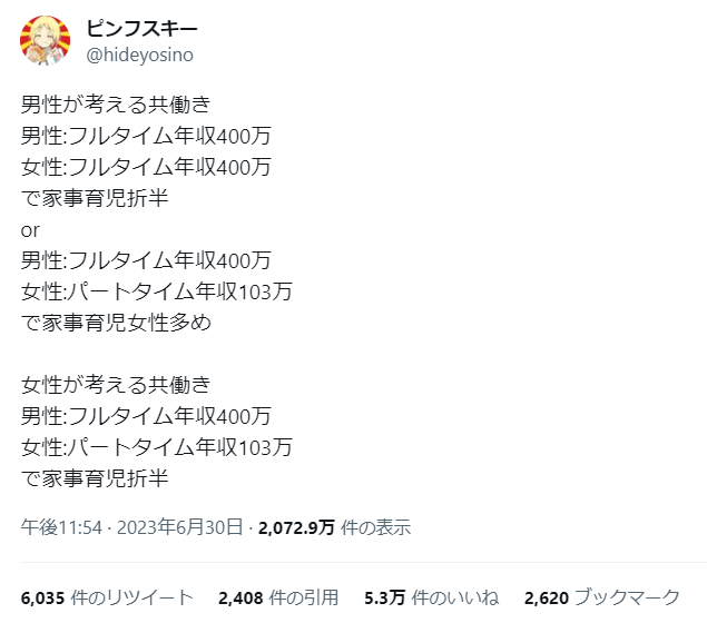 男女の考える共働きが全く別物で衝撃。フルタイム労働する女性は40年増えていない