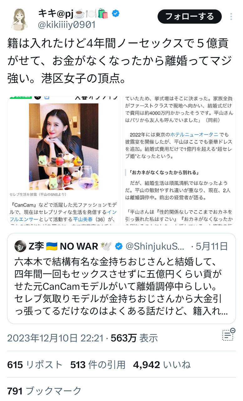 ホーム > 投稿 > 5億貢がせてお金が無くなったら離婚した港区女子がすごすぎる。これが偉大なる女の力 2023/12/19 【画像】港区女子の頂点、ガチのマジで凄すぎる……ノーセッ◯スで男に5億貢がせて離婚 1: それでも動く名無し 2023/12/12(火) 21:29:08.00 ID:O+SUV5CZ01212 すげー 続きを読む B! LINEへ送る - 投稿, 泥・セコケチ